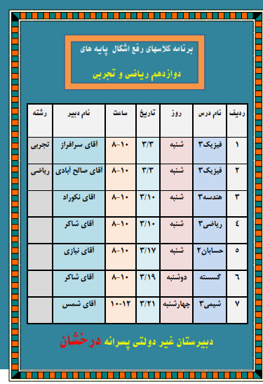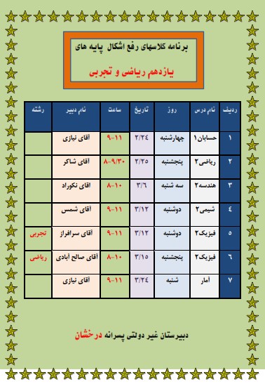 برنامه کلاسهای رفع اشکال پایه دوازدهم ریاضی و تجربی