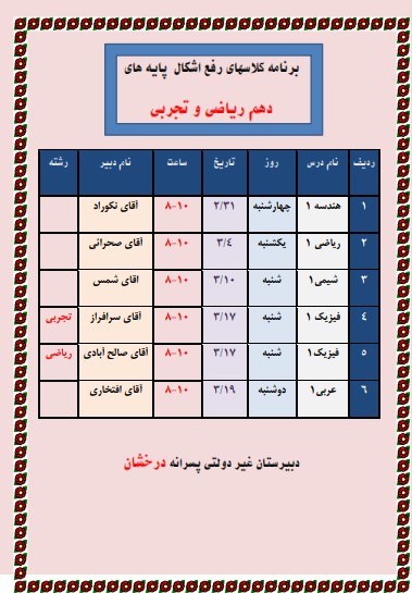 برنامه کلاسهای رفع اشکال پایه دهم ریاضی و تجربی