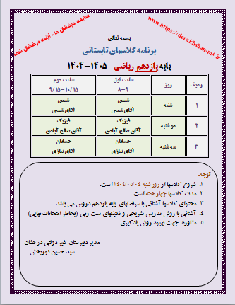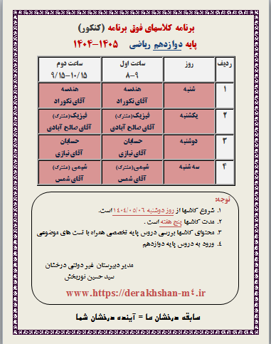 برنامه کلاسهای فوق برنامه ( کنکور) دوازدهم ریاضی