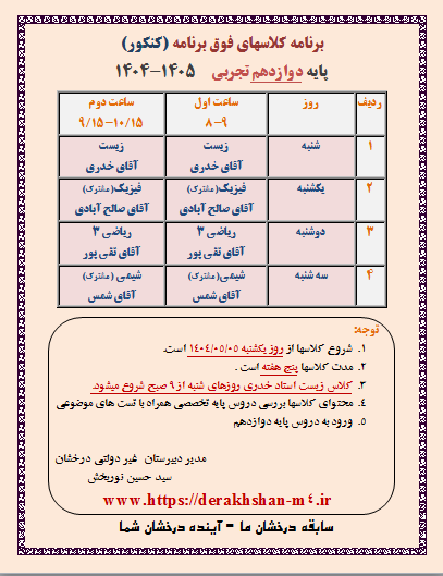 برنامه کلاسهای فوق برنامه( کنکور) دوازدهم تجربی