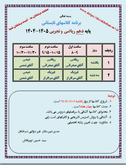 برنامه کلاسهای تابستانی دهم ریاضی و تجربی